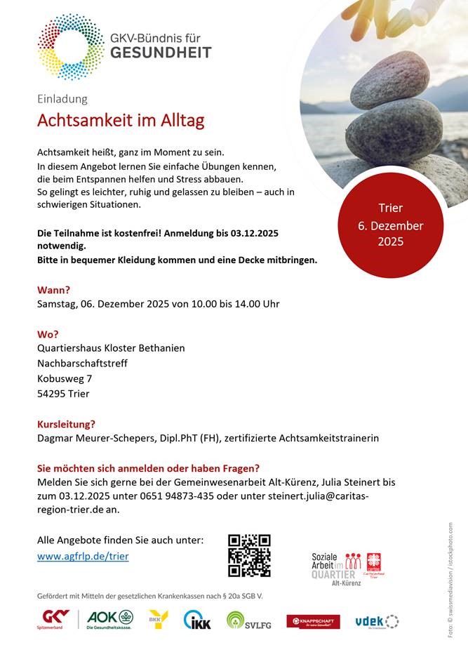 Die Teilnahme ist kostenfrei. Anmeldung unter: Caritasverband Trier e.V., Stadtteilbüro, Domänenstraße 92, 54295 Trier, Tel. 0651/94873-435 oder 0151 43116540, steinert.julia@caritas-region-trier.de
